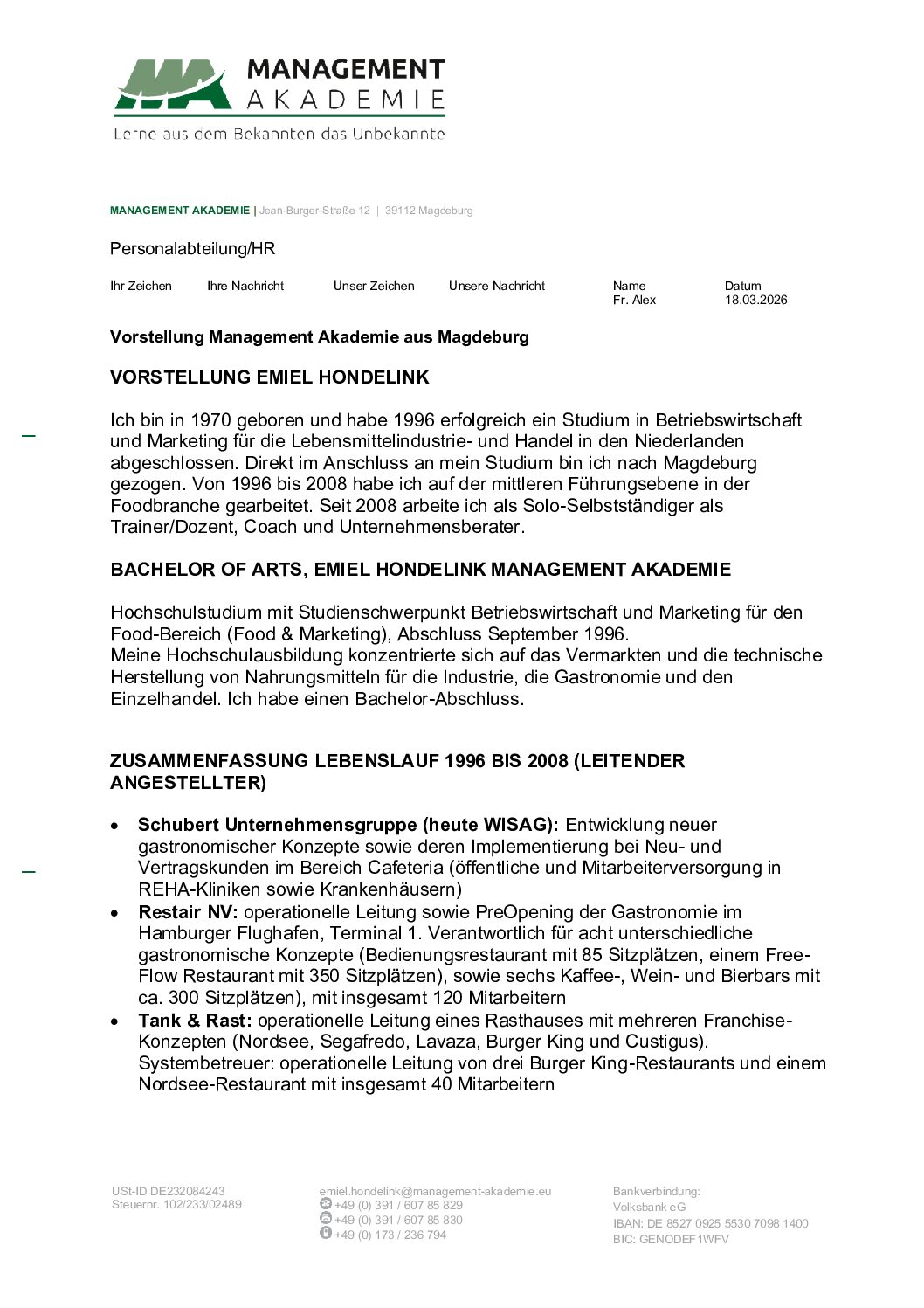 In leitenden Funktionen bei Unternehmen wie McDonald’s, Tank & Rast und WISAG war ich als Area Manager für bis zu 30 Filialen verantwortlich. Darüber hinaus leitete ich als General Manager die komplette Gastronomie eines Terminals mit acht Outlets und rund 120 Mitarbeitenden. Insgesamt habe ich auf mittlerer Führungsebene mit voller Ergebnis- und Personalverantwortung gearbeitet. Diese umfangreichen praktischen Erfahrungen bilden die Grundlage für meine freiberufliche Tätigkeit als Dozent, Coach und Outplacement-Berater.